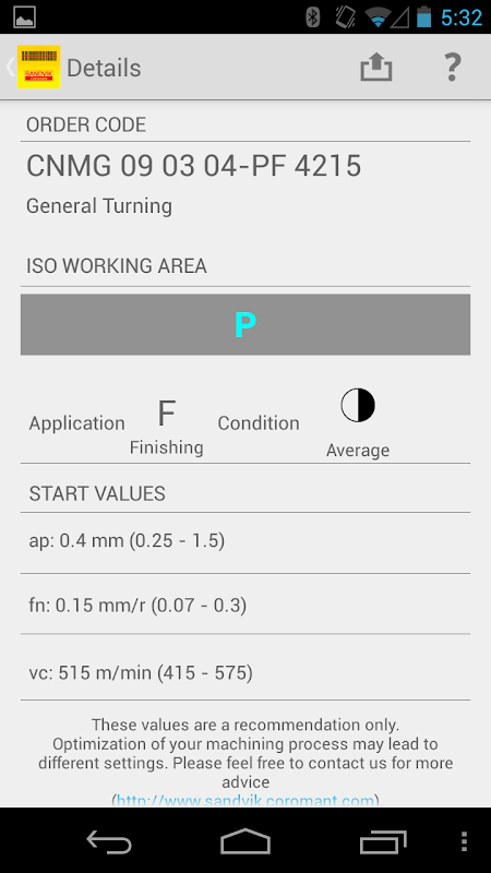 Sandvik Coromant Start Values will give you recommended cutting data (speed, feed and depth of cut) for your machining operations.