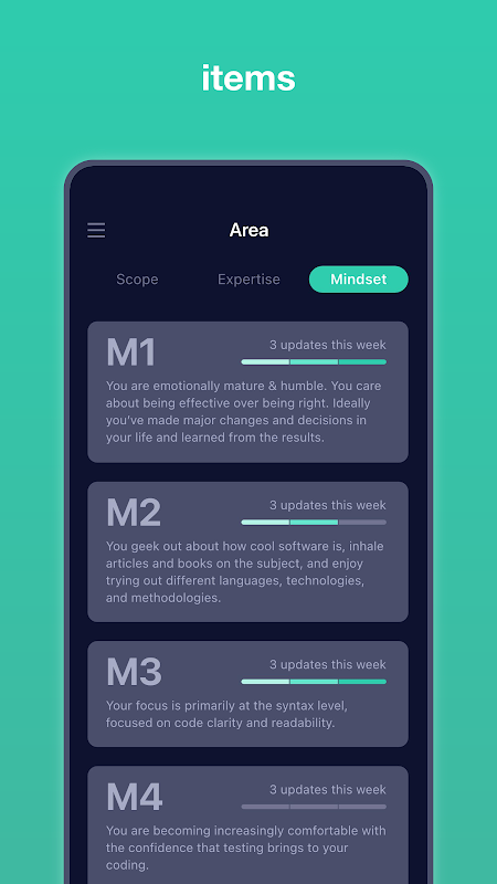 В Stepper вы работаете над недостающими и слабыми местами, пытаетесь улучшить шаг за шагом и пишете о них обновления. Чем больше предметов вы совершенствуете, тем выше уровень вашей профессии.