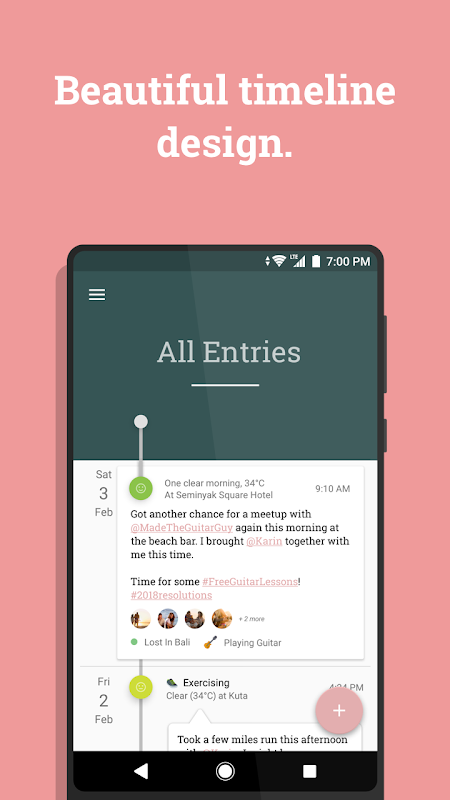 Дневник / журнал с дизайном шкалы времени, контекстуально богатыми записями, и настроением трекером.