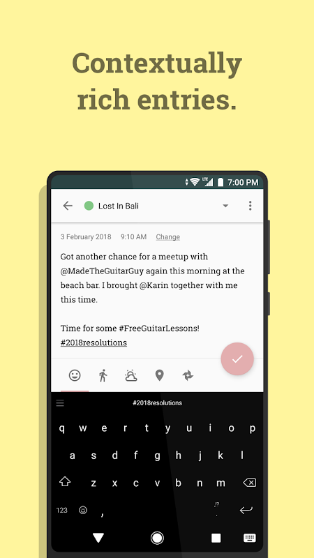 ★ Contextually rich entries. Remember more than just thoughts and feelings; attach information about the activity you're doing, the place you're in, current weather condition, and even people that are with you!