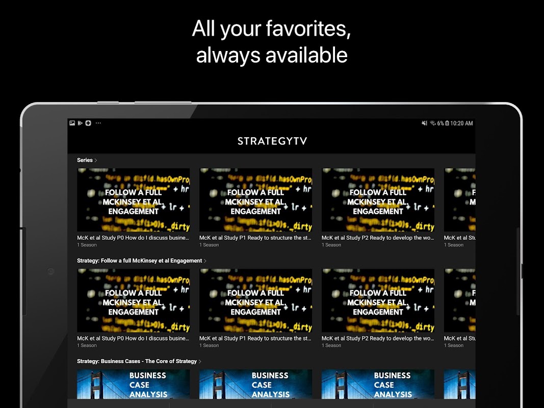 StrategyTV - это интерактивный 24-часовой учебный курс по стратегии, предлагающий невероятно подробные и реалистичные учебные программы по стратегии, операциям, реализации, лидерству, управлению, решению критических проблем и опросам конкретных случаев. Весь наш контент создается выдающимися бывшими McKinsey, BCG и другими партнерами, такими как Кевин П. Койн, Билл Матассони и др.