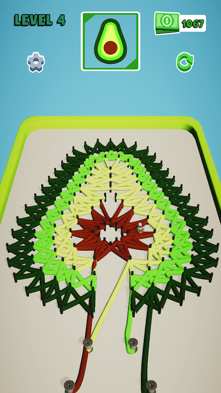 Двигайтесь к каждой струне и начинайте плести ее вокруг штифтов, чтобы создать шедевр. Проверьте эталонную модель, если вы ошиблись, просто расплетите и попробуйте снова!