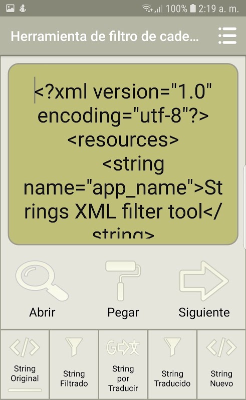 Обычно вы отправляете файл strings.xml на свой телефон, открываете его и фильтруете с помощью этого приложения. Затем скопируйте результат в свой любимый переводчик, переведенный результат снова вставьте в приложение, чтобы вернуть всю исходную структуру файла.
