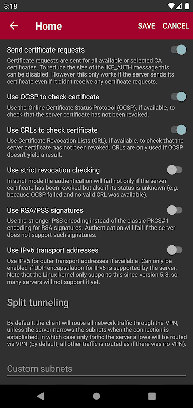 Подробности и список изменений можно найти в нашей документации: https://docs.strongswan.org/docs/latest/os/androidVpnClient.html.