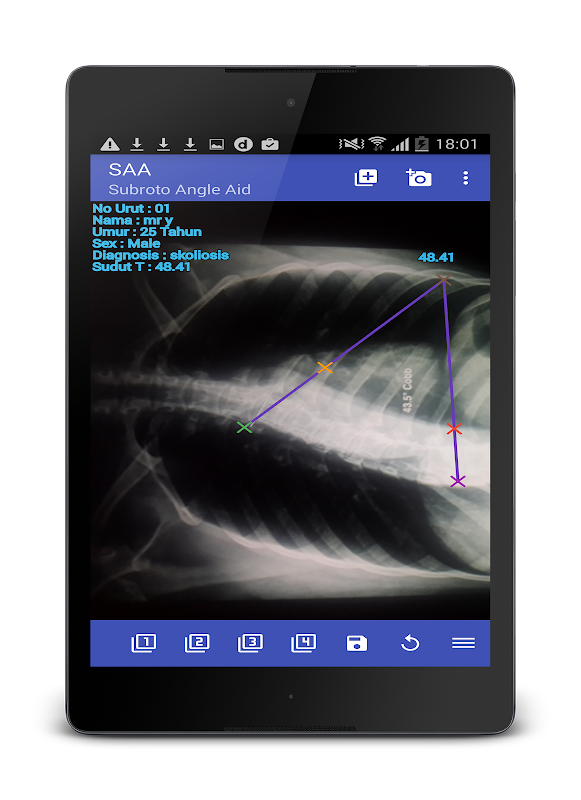 Subroto Угол помощи (SAA), приложение, которое может быть использовано для измерения угла кривизны сколиоза и поворота установочной фиксации устройства сколиоза позвоночника по методу Кобба с использованием мягкой копии картина х луча проста в использовании, быстрый, точный и доступный.