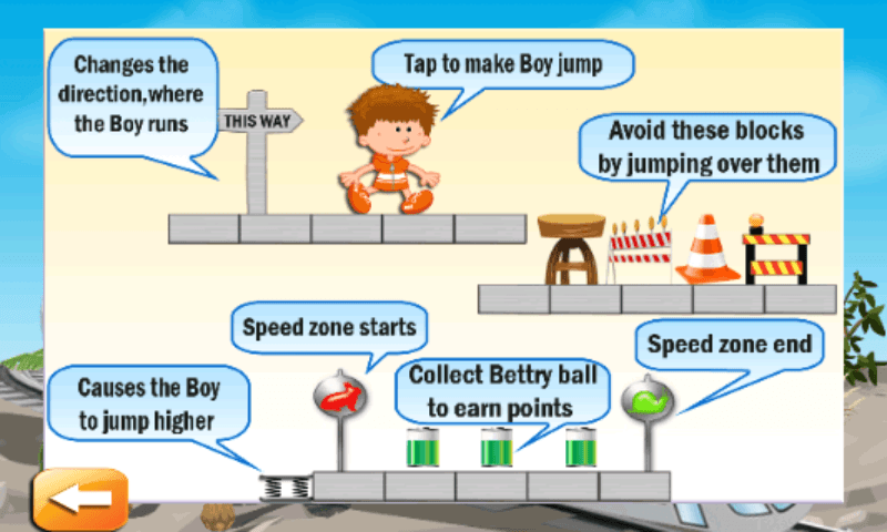 Вы должны помочь Мальчик всякий раз, когда есть какие-либо препятствием на пути, нажмите на экран, чтобы мальчик прыгать через препятствия и ямы. На пути мальчик продолжает собирать питания батареи. Есть много препятствий и опасностей, которые вы должны избегать, нажав на экране. Используйте весной площадку для Mega Jump. Когда мальчик работает над весенней площадку, он прыгает выше, чем обычно, чтобы доходить до верхнего этажа. Он чувствует, как полет и продолжает собирать больше батарей.