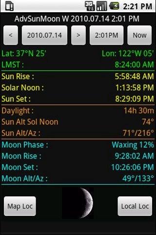 Advanced users my like AdvSunMoon: can choose location from map instead of only local GPS location; GPS not needed: will use last loc. DE, EN, FR, ES languages, AM/PM time, Help info.