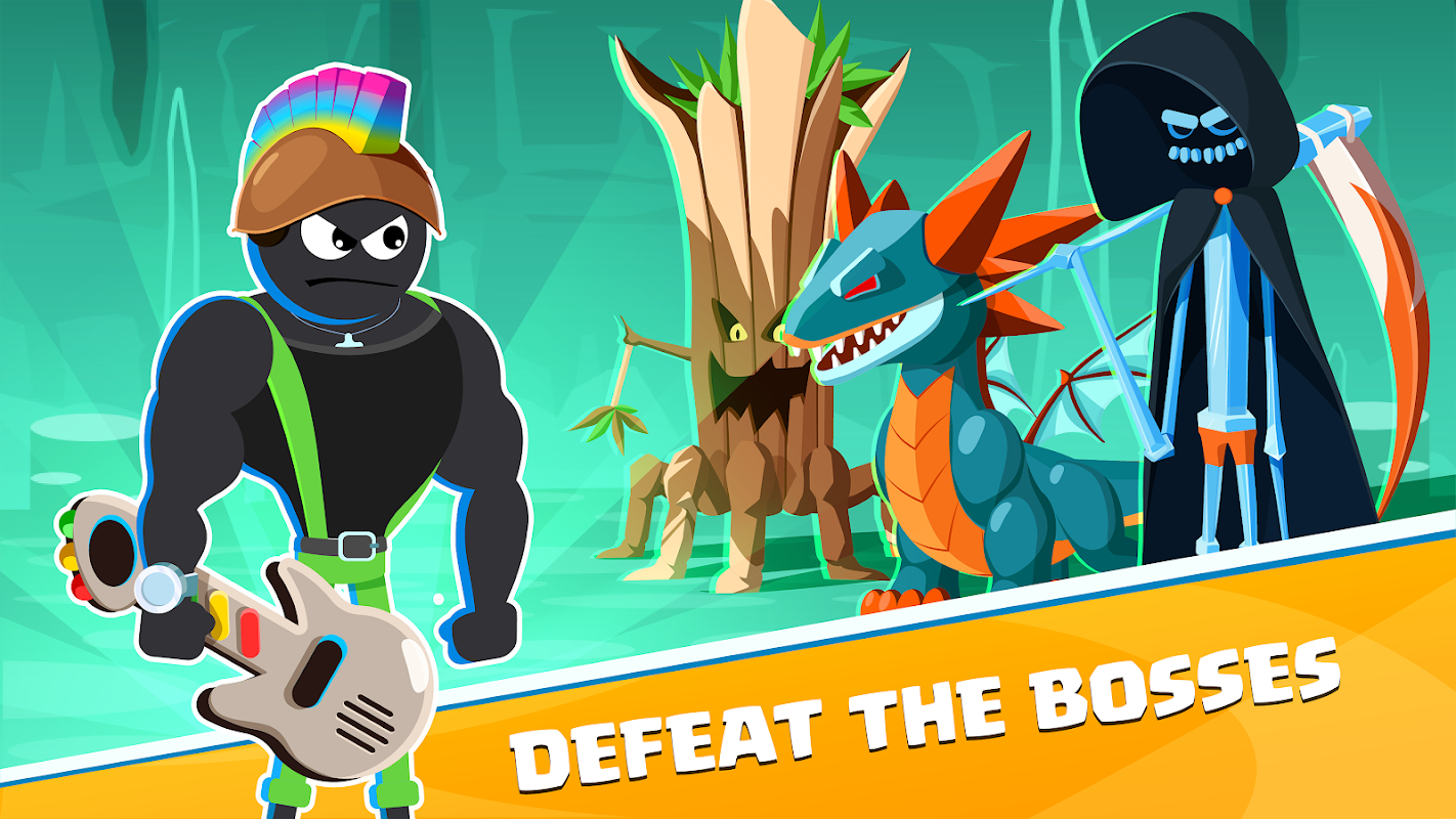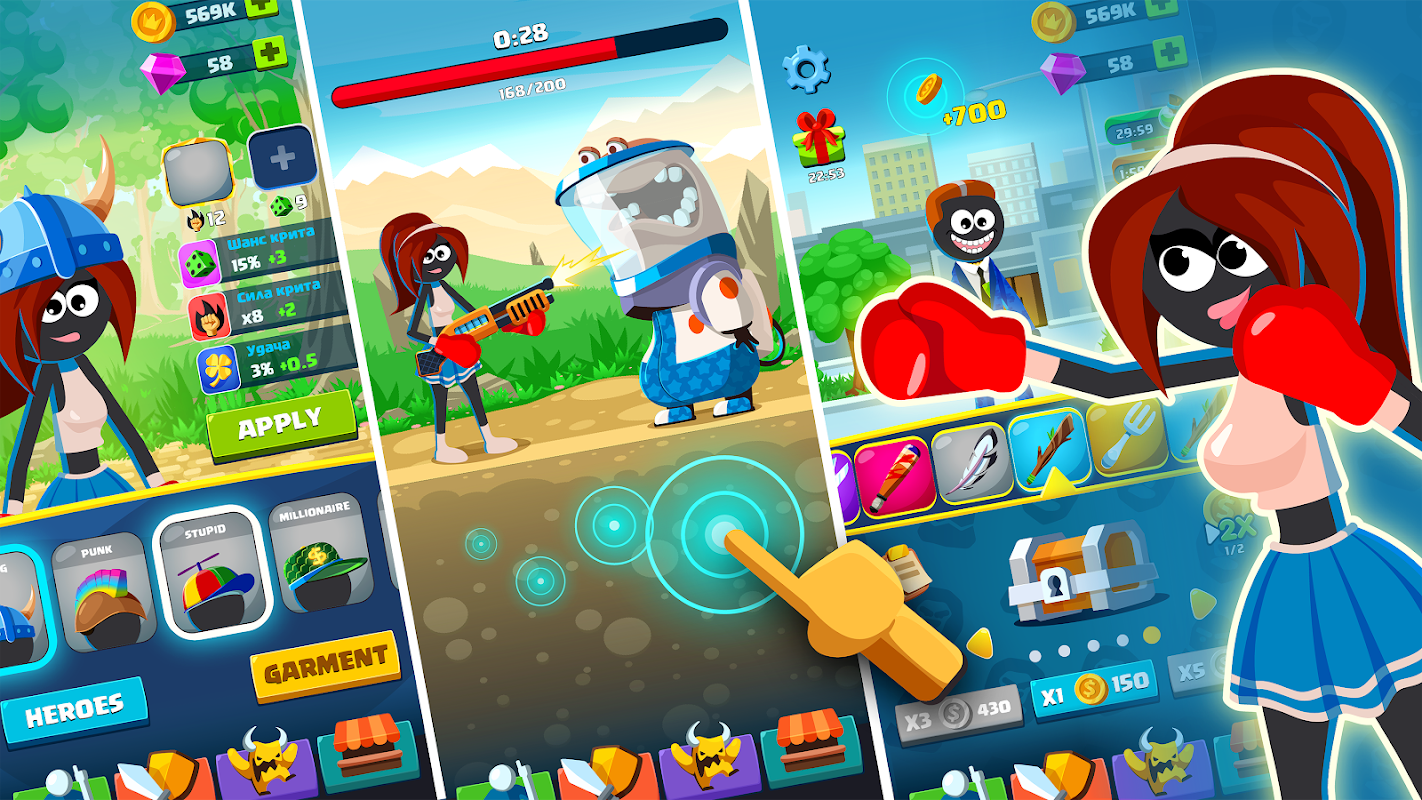 • Кликай по экарну , зарабатывай деньги, открывай сундуки, прокачивай оружие, затем бей и побеждай Боссов, у них забирай уникальную награду! Потом выбивай питомцев, прокачивай броню, открой все 5 сундуков с оружием и так дойди до 30го босса) Всё легко)