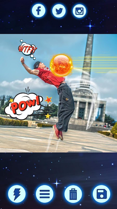 Creați propriul dvs. super-erou și luptați împotriva nemesisului super puteri dvs. cu cel mai distractiv producător de filme de acțiune super putere și editorul Chidori. Super Puteri Efecte Foto - Editor De Fotografii este ultimul editor de fotografii filme de actiune super-saiyan, care vă va transforma într-un adevărat luptător de stradă și vă va lăsa să decorați fotografiile cu efecte minunate de film de acțiune efecte speciale. Faceți lupte cu karate și aflați arte marțiale prin adăugarea de efecte de explozie și efecte foto realiste ale filmului fx pe imaginile dvs efecte de film. Aflați ce este superputerea voastră și vrăji magice grație datorită celei mai nebunești aplicații de super-putere pline de efecte super-puteri fx. Încercați această cameră kamehameha dragon pentru a merge super saiyan, sau pentru a alege efecte speciale pentru editor foto super-erou a impresiona o fată - descărcați acest editor de super-putere acum și deveniți un real super erou.