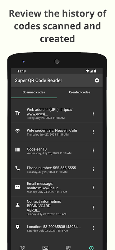 - Следите за всеми прочитанными и созданными кодами в разделе «История».