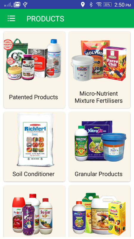 Огромный отклик на эту деятельность привел к появлению собственных продуктов и созданию лаборатории для ассортимента R и D. Swaroops в настоящее время включает MICRO-NUTRIENTS, NATURAL AND CERTIFIED ORGANIC GROWTH PROMOTERS, 100% ЕСТЕСТВЕННЫЕ ТРАВЯНЫЕ ПЕСТИЦИДЫ, СПЕЦИАЛЬНЫЕ НЕОРГАНИЧЕСКИЕ АГРОХИМИИЛЫ, а также пестициды. Swaroop производит около 50 продуктов, которые находят применение практически для всех видов полевых культур, овощей, кассовых культур, цветоводства и садоводства.