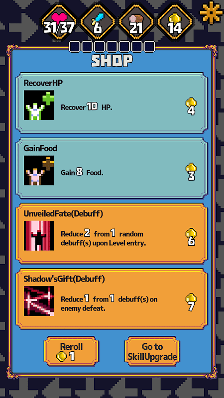 Между этажами покупайте способности, улучшайте навыки и улучшайте своего персонажа!