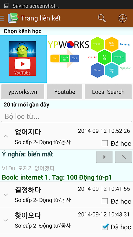 Sổ tay từ điển tiếng Hàn Quốc "Korean Dictionary Note" của YPWORKS là ứng dụng trên android giúp bạn tăng cường vốn từ vựng. Bạn có thể tra cứu từ điển tiếng Hàn Quốc online, sau đó lưu trữ trong máy để học tập lại hiệu quả. Bạn có thể dễ dàng quản lý các mục đã tra cứu bằng bộ lọc của chương trình. Ngoài ra, bạn có thể thu âm giọng nói của mình về phát âm của từ mới hoặc bài hội thoại nào đó.