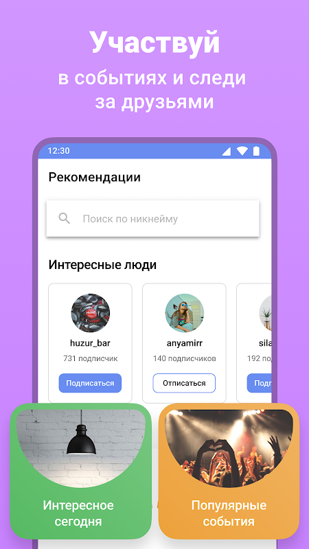 - организовывать свои мероприятия: прогулки с собаками или пенная вечеринка, вписка или поход в библиотеку - твои события могут быть любыми. Компания найдется для каждого!