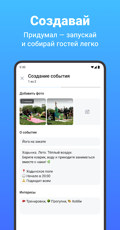 - организовывать свои мероприятия: прогулки с собаками или пенная вечеринка, вписка или поход в библиотеку - твои события могут быть любыми. Компания найдется для каждого!