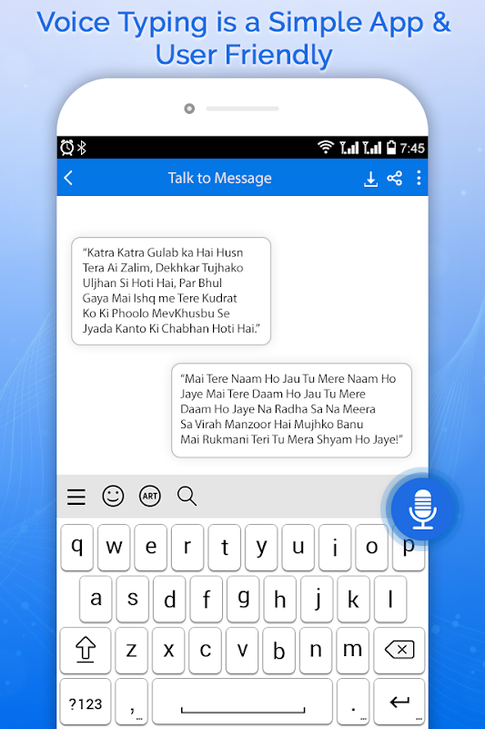 Talk n Type Voice Typing Keyboard In All Language is a simple app and user friendly application. The text appears after you done Talking. Once you get the regularity, you can use the app and send, share long texts and articles in other social media and many social media messaging application. voice typing Supports more than 70 different languages.