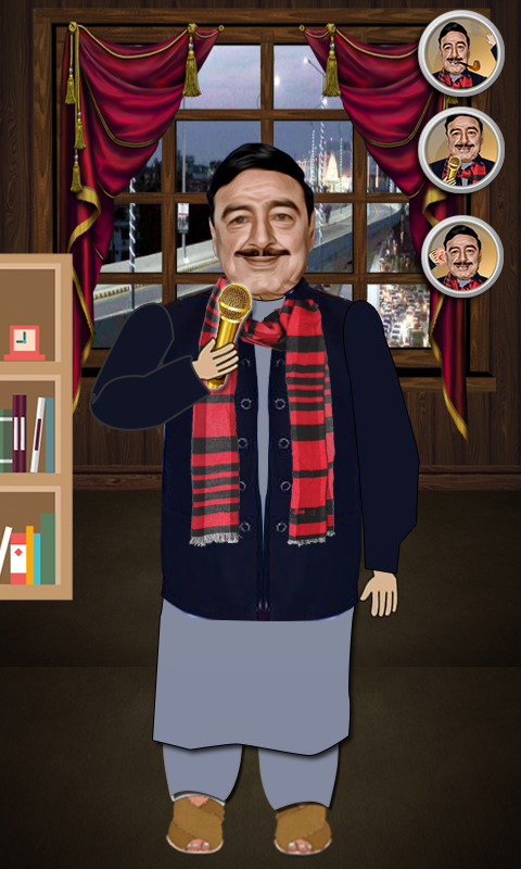 Enjoy the funny political cartoon of Awami Muslim League (AML) leader Sheikh Rasheed Ahmad. The talking Sheikh Rasheed Ahmad contains naughty catch phrases along with funny dirty dancing of sheikh Rasheed. The talking Sheikh Rasheed Ahmad renders the funny dancing and singing of Sheikh Rasheed Ahmad. The political cartoon provides the funny Sheikh Rasheed smoking cigar in lal haveli. The talking sheikh Rasheed app also contains Sheikh Rasheed eating and funny speech with naughty catchphrases and dirty dancing. The talking sheikh Rasheed Ahmad provides you the ultimate fun with special funny slogans against PMLN like “go nawaz go” and “mujhe kyun nikala”. The talking sheikh Rasheed contains the friendly slogans for PTI and Imran khan like naya Pakistan with other famous slogans of PTI.