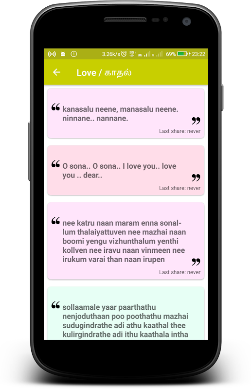 Tamil Status app contains following types of Latest Status in Tamil Font.