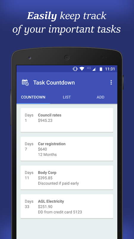 Обратный отсчет задач - очень простой список задач, отсортированный по дням до наступления срока. Организуйте себя с минимальными усилиями. Меньше стрессов, больше концентрации и достижения лучших результатов.