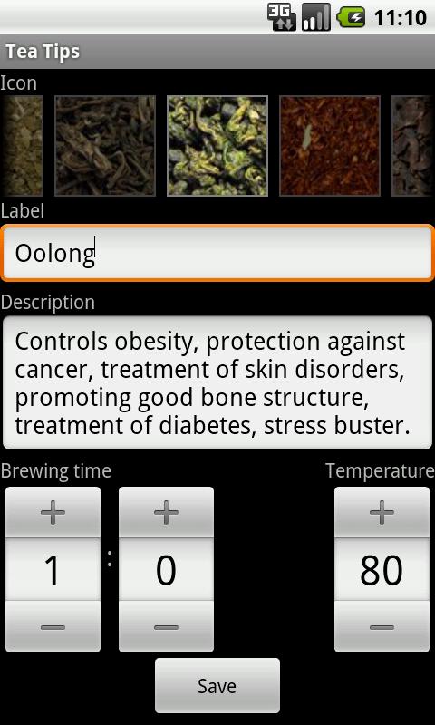 Заметки с описанием полезных свойств по основным видам чая, временем заваривания и температурой. Добавляй свои любимые напитки.