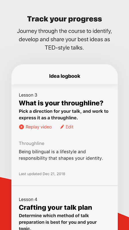 + Овладеть ключевыми приемами, которые используют ораторы TED для проведения великолепных выступлений. Каждая техника преподается с использованием ярких анимаций и клипов из знаменитых выступлений TED.