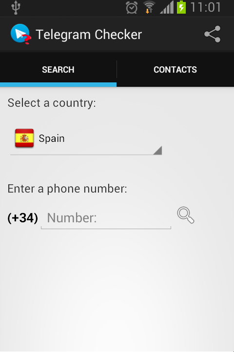 Do you want to know how many of your friends have moved to Telegram from Whatsapp? With this application you could enter a phone number from any country and check if you it's registered with the Telegram application without registering or giving your telephone number to Telegram. You can also let the application search for you on all your contacts book.