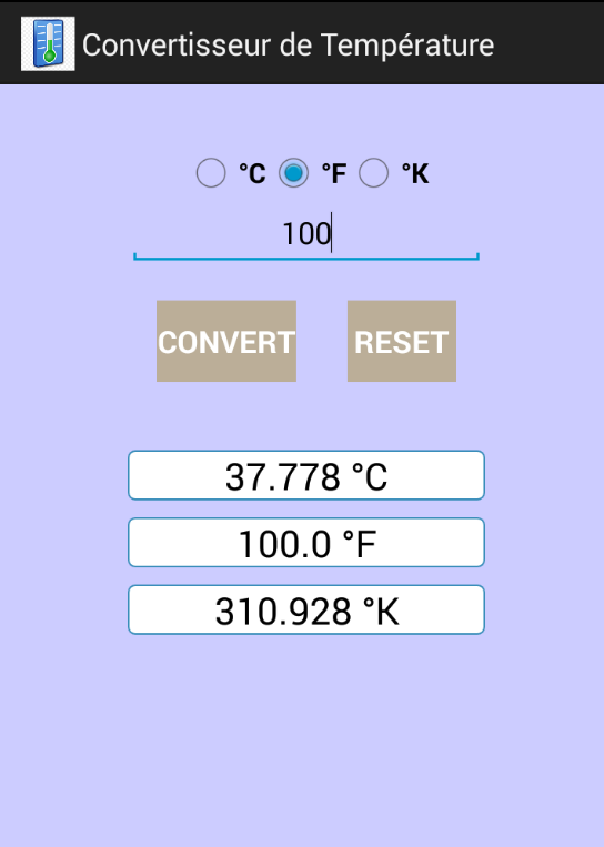 Приложение легко, просто и бесплатно, это позволяет преобразовывать температуру Цельсия (° C) до (F) и (к °) Фаренгейта (° F) до (С) и (° к) или Кельвина (° к) (° с) (° F).