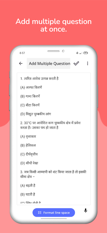 Добавляя свою книгу и экзаменационные вопросы в приложение для создания вопросов. Вы можете улучшить свое исследование, часто отвечая на него или пересматривая его. И вместе вы можете увидеть свой счет. в любом месте в любое время без интернета.