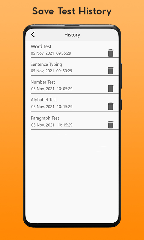 В приложении для практики набора текста пользователи могут проверить скорость текста, точность, правильность слов и неправильные слова. Проверьте историю тестов скорости с помощью приложения для улучшения скорости набора текста. В тесте скорости печати пользователи могут получить три уровня набора текста (легкий, средний и жесткий).