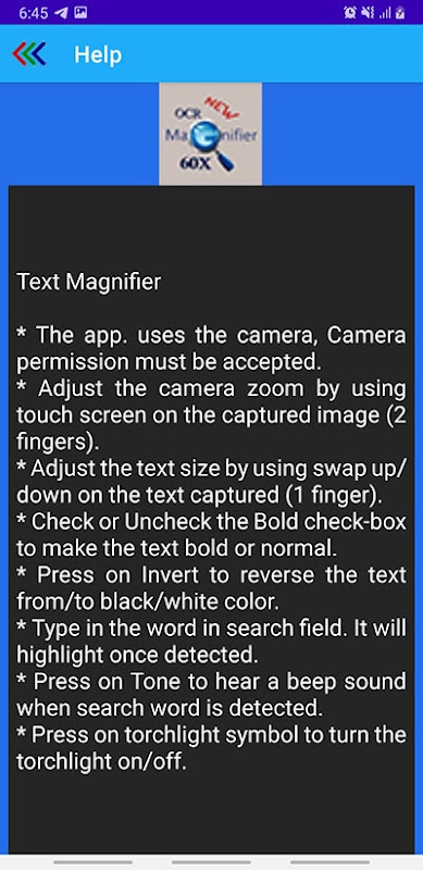 Загрузите наше приложение для увеличения цифрового текста, и вы сможете четко читать даже самый крошечный печатный текст. Наконец, вы увидите все крупно и четко. Кроме того, вы перестанете винить себя за свое несовершенное зрение. Кроме того, чтобы получить лучшую лупу, вы также сможете настроить выводимый текст.