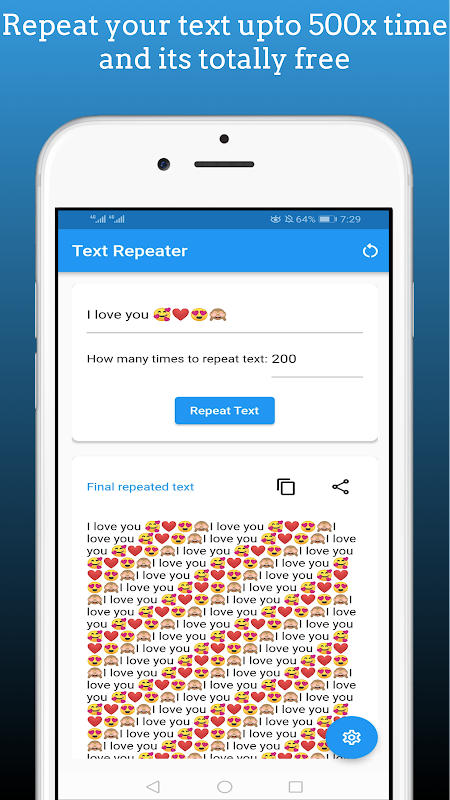 Text Repeater — лучший способ повторять текст и смайлики столько раз, сколько вы решите удивить своих ДРУЗЕЙ и ПАРТНЕРОВ длинным сообщением, чтобы выразить свою ЛЮБОВЬ.