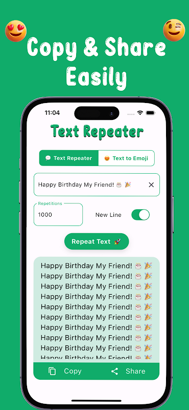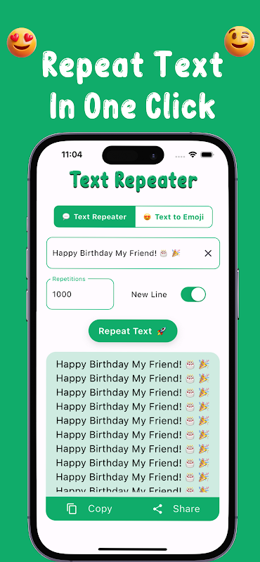Text Repeater — Emoji Repeater дает вам возможность раскрыть свой творческий потенциал и создавать сообщения, которые находят отклик у вашей аудитории. Независимо от того, передаете ли вы искренние чувства с помощью сердечного текста или добавляете игривости с помощью милого текста-символа, наше приложение создано для того, чтобы улучшить ваши впечатления от обмена сообщениями.