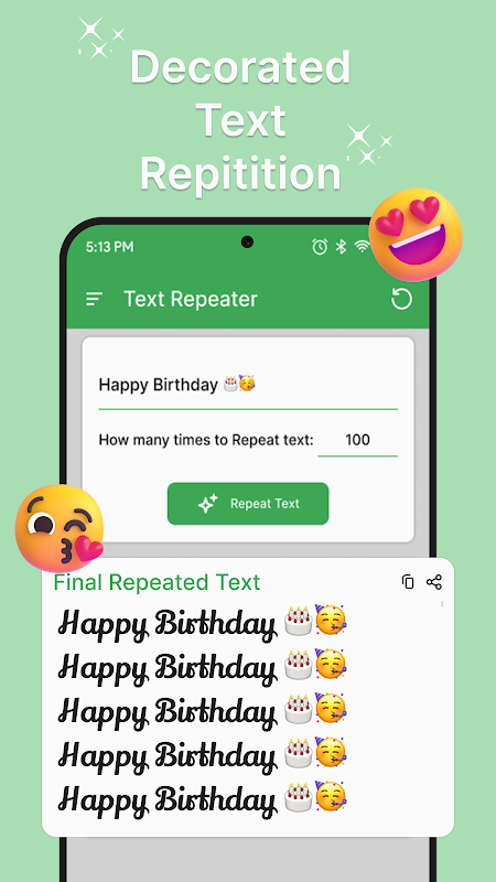 Повторитель текста позволяет повторять текст, включая смайлики и специальное форматирование, и идеально подходит для любого случая. Хотите ли вы послать веселую шутку или любовное послание, наше приложение сделает это без труда.