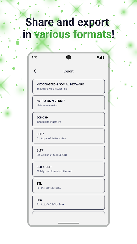Как только ваша 3D-модель будет готова, распечатайте ее на 3D-принтере, и поделиться ею будет совсем несложно! Отправьте его в Blender, Unity, игры или друзьям по ссылке или в виде видео MP4 или экспортируйте его в различные форматы, такие как GLB/GLTF, STL или USDZ, для более творческого развлечения или 3D-печать.