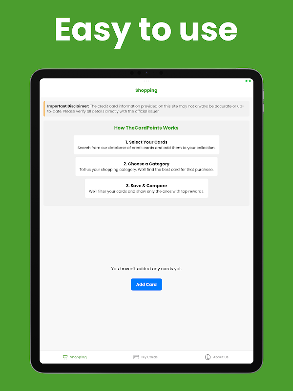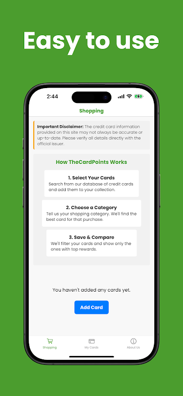 TheCardPoints помогает вам максимально эффективно использовать свои кредитные карты, рекомендуя лучшую карту для каждой покупки — как в магазине, так и через Интернет. Сохраняйте свои карты, осуществляйте поиск по категориям или брендам и получайте уведомления в режиме реального времени о ближайших предложениях. Никогда больше не пропустите кэшбэк, баллы или эксклюзивные предложения!