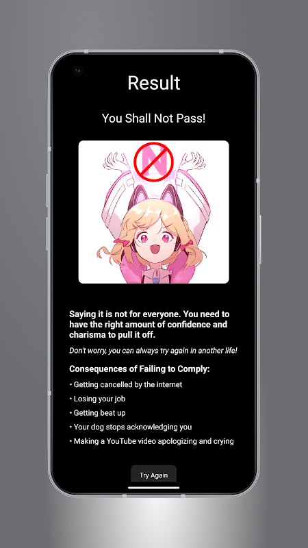 Взаимодействие намеренно простое: откройте приложение, пройдите все этапы и получите свой ироничный вердикт. Оно создано для смеха, а не для поучений.