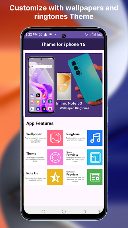 С помощью тем для обоев, рингтонов и тем для Infinix Note 50 вы можете полностью преобразить свой телефон и сделать его таким же, как Infinix Note 50. Темы для обоев Infinix Note 50 мгновенно придадут вашему экрану элегантный и высококачественный вид, а темы для рингтонов Infinix Note 50 наполнят ваше устройство четким высококачественным звуком для каждого звонка и уведомления. Кроме того, с помощью тем «Темы для Infinix Note 50» вы можете настроить интерфейс своего телефона в соответствии со стильным дизайном Infinix Note 50. Это лучший способ улучшить внешний вид и удобство использования вашего телефона — так же, как если бы вы держали в руках собственный Infinix Note 50!