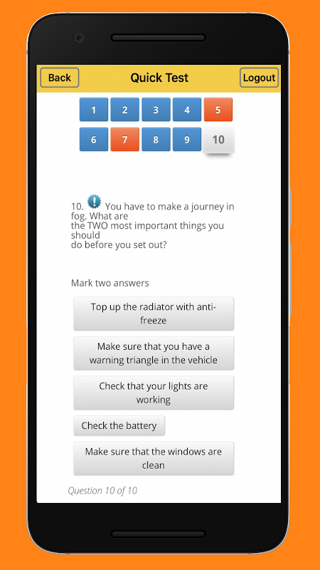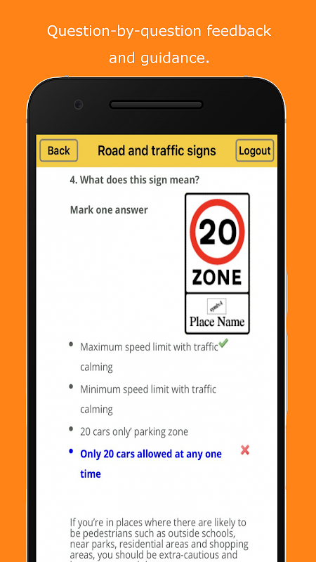 In Practice mode you can work your way through the 14 topics that the theory test is comprised of, making use of hints and explanations to guide you to gain vital knowledge of all areas of the test.
