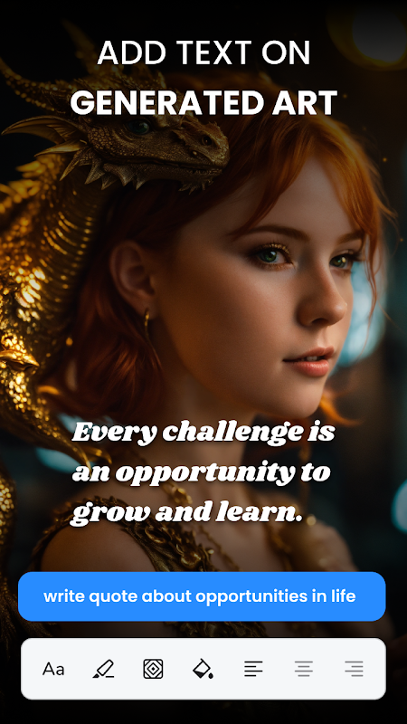 • Генерация текста с помощью искусственного интеллекта: усовершенствуйте свои произведения искусства с помощью текста, сгенерированного искусственным интеллектом, добавляя глубину и контекст вашим творениям.