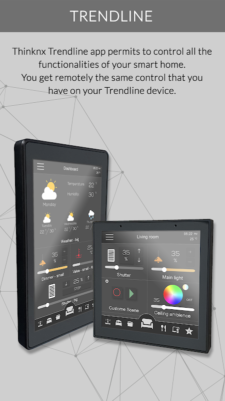 Благодаря опыту тысяч установок компания Thinknx создала Thinknx Trendline. Оно объединяет беспрецедентную свободу для конечного пользователя с еще более быстрым и простым вводом в эксплуатацию для системного интегратора. Приложение поднимает уровень пользовательских интерфейсов для профессиональной домашней автоматизации.