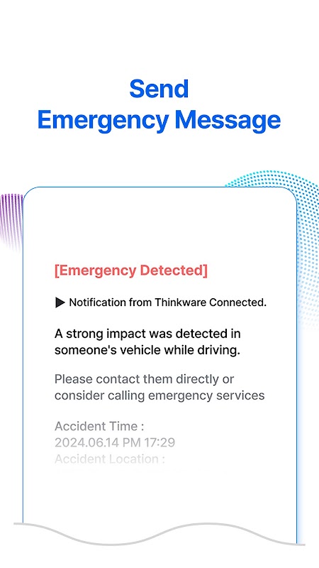 В случае чрезвычайной ситуации зарегистрируйте контактные данные вашей семьи, друзей или коллег. Сообщение SOS будет отправлено вашему контактному лицу в случае сильного удара или при нажатии водителем кнопки SOS на видеорегистраторе для экстренного вызова помощи.