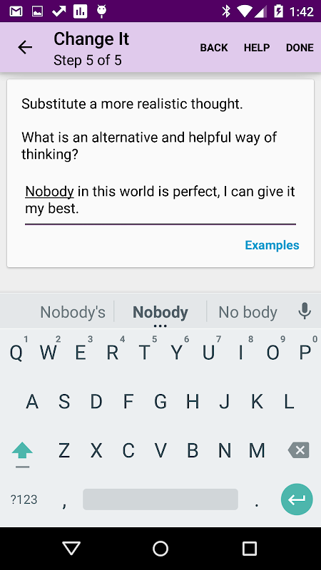 Thought Challenger helps you gain control of how you feel and what you do by teaching you to notice and challenge negative and unhelpful thoughts. Thought Challenger is built on cognitive behavioral therapy - a structure that has been found in clinical studies to be useful in examining negative thoughts and reframing them to help you feel better and do the things you want to do.