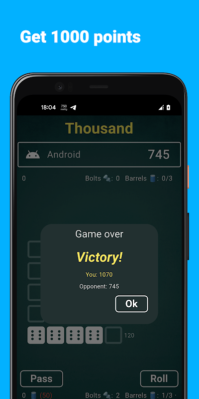 Thousand — игра в кости, цель которой — набрать 1000 очков. Но это не так просто, так как на этом пути есть несколько препятствий: обязательный счет для стартовой игры, две лунки, самосвал и бочки.