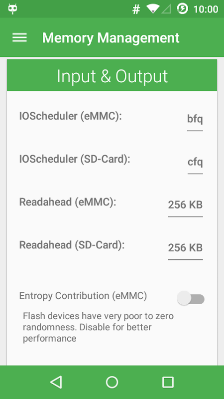 • Memory Management section for applying various tweaks like changing IOScheduler, Swappiness, VFS Cache Pressure, switching entropy contribution.