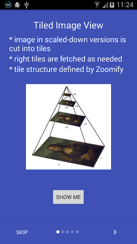 Demonstration of Open source library for Android that enables apps to include Image View that loads images by tiles through Zoomify protocol.