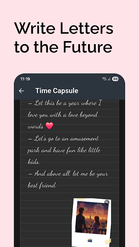 Будь то пожелание на день рождения, любовное письмо, вызов или просто памятный момент — Time Capsule делает его более захватывающим и душевным.