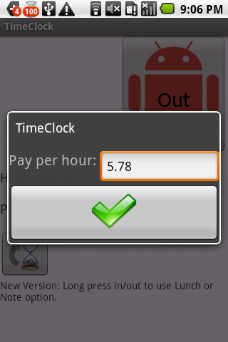 This is a simple app that will allow you to keep track of your work hours, Clocked in and clocked out. You can enter your pay to see how much you should make this period. It will output TimeClock.txt to your SD card root. This is a log of all of your times. Also includes a BETA widget.