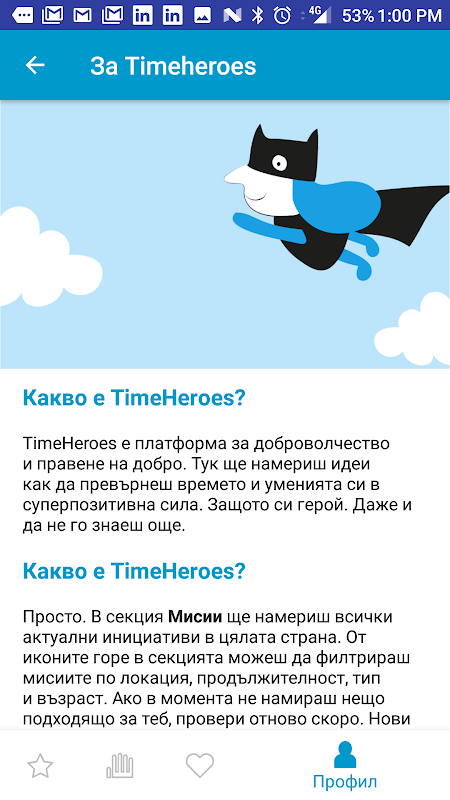 TimeHeroes е платформа за доброволчество и правене на добро. Чрез приложението ще намериш идеи как да превърнеш времето и уменията си в суперпозитивна сила. Защото си герой. Даже и да не го знаеш още.