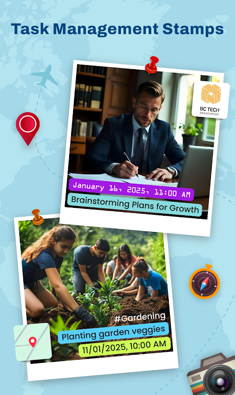 📌 Open the app and select the stamps you need—Date & Time, Map, Logo, Notes, etc