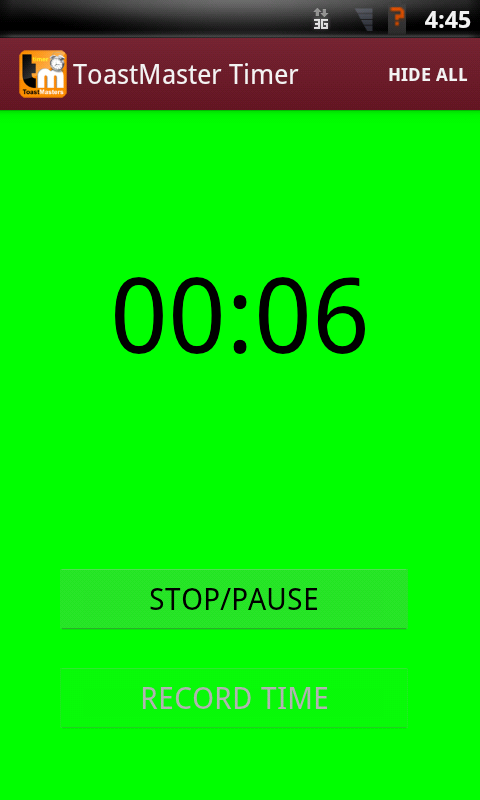 Toastmasters Speech Timer totally simplifies the task. While it's as easy to use as a stopwatch, it does a lot more. During a speach, when it's time to show the green, yellow or red light to a speaker, the app causes screen to rapidly blink. The blinking screen is very noticeable. So you can just enjoy the speech and no more constant shuffling your gaze from the speaker to the stopwatch! You'll know when it's time to signal the speaker!